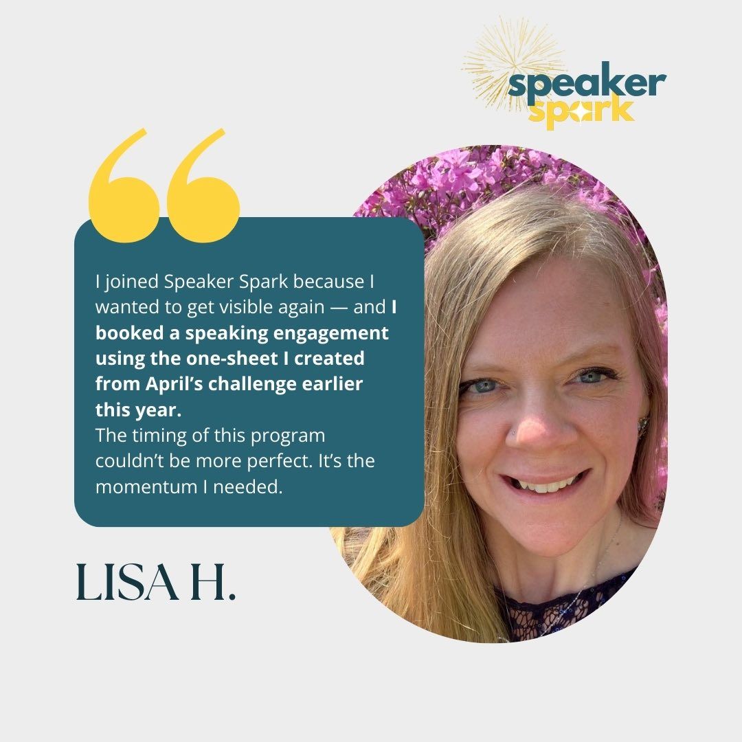 Kelly is an alumni of our Speak Easy program, but even experienced speakers need a boost! She stepped into the Speaker Spark and got her bookings flowing again!Â